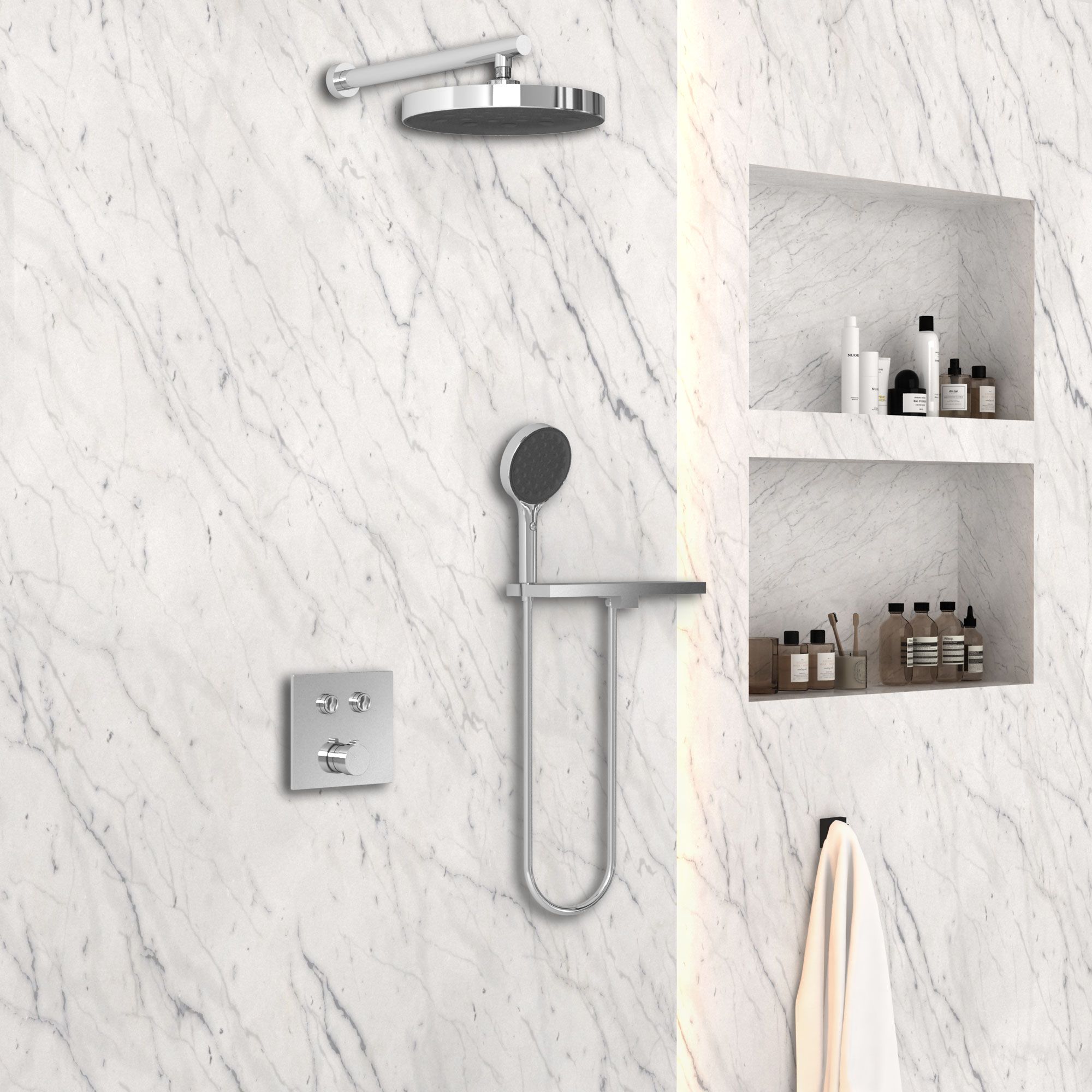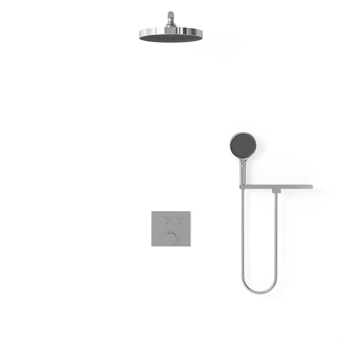 Верхний душ, полка с изливом и держателем ручного душа, ручной душ, смеситель со встраиваемой частью |
