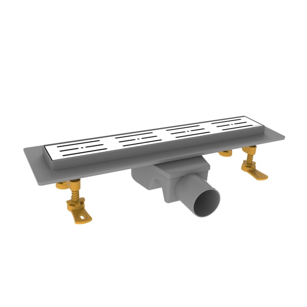 Душевой канал с решеткой из нерж. стали, с сухим клапаном, прямоугольный, с площадкой под керамическую плитку, 63*300, 360⁰ горизонтальный выход Ø50