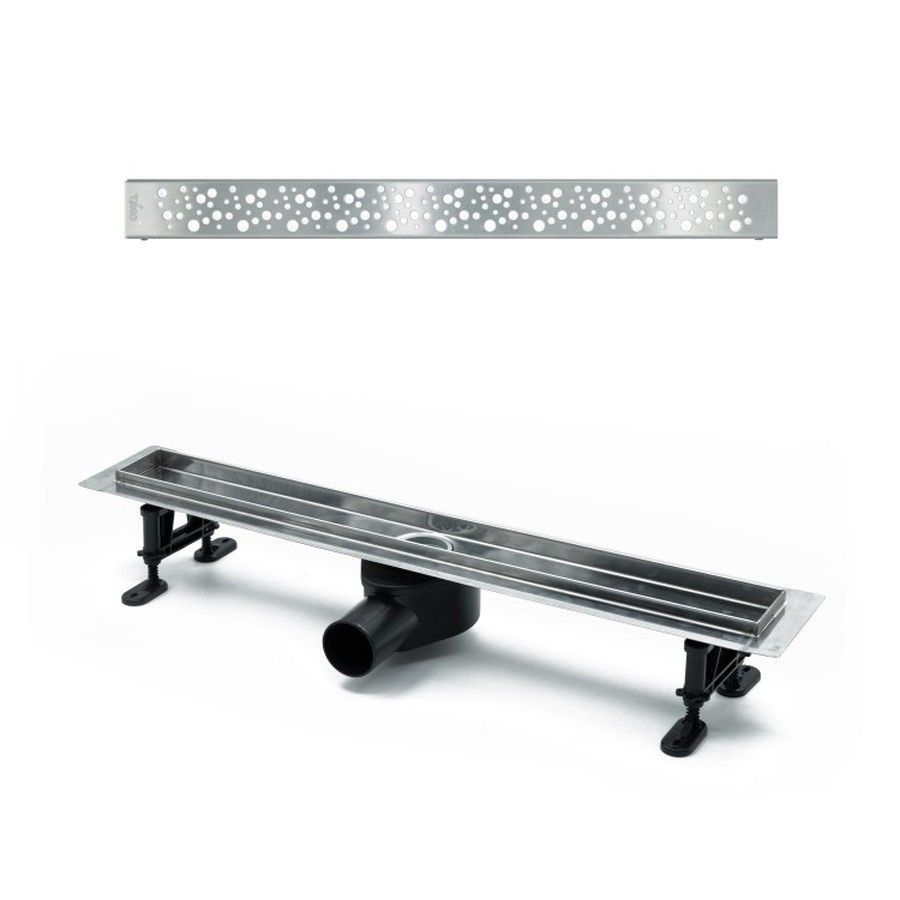 водоотводящий желоб из нержавеющей стали; декоративная панель "lines"; заглушка монтажная; поворотный сифон DN50, выход вбок; комплект регулируемых опор; стакан с мембраной; улавливатель волос и мусора; гидроизоляционная лента; сервисный ключ |