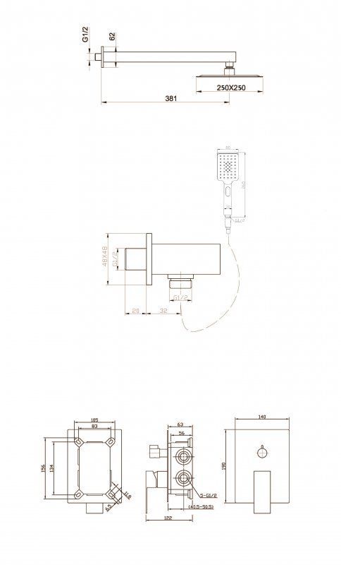 Оснащение: встраиваемый смеситель с переключателем на два выхода, верхний душ диаметр 25 см с изливом, ручной душ 3-х режимный со шлангом, штуцером и держателем