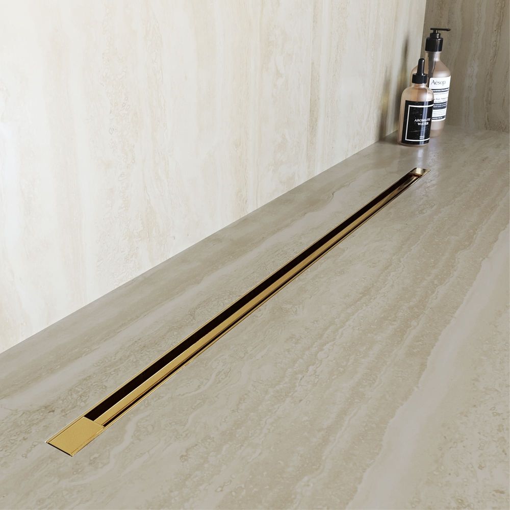 Принимающей декоративный жёлоб маскирует сливное устройство, образует щель, куда сливается вся вода из душевого пространства. Для того чтобы вода эффективно отводилась в трап, на этапе монтажа необходимо обеспечить уклон облицовочной плитки в сторону принимающего жёлоба.