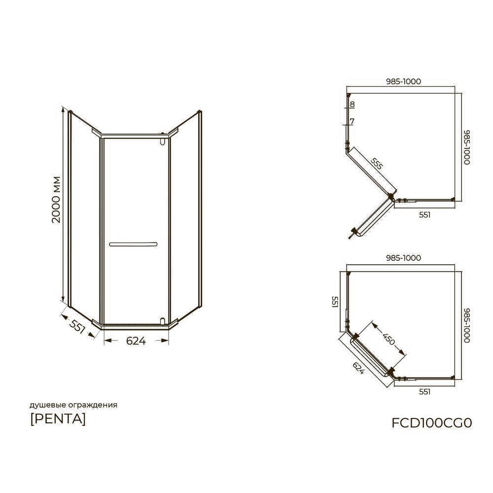 Душевой уголок Knotlor FCD100CG0BL 5-тиугольный 100х100х200, черный. Просторное пятиугольное ограждение 100×200×100 см с матовым черным профилем и стеклом 8 мм. Идеально подходит для угловых душевых, создавая современный и стильный интерьер ванной.