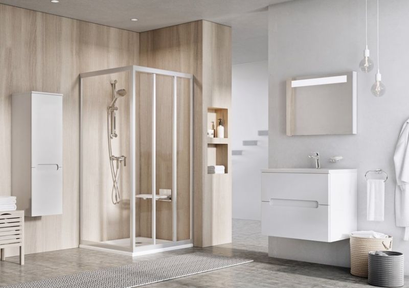 Душевой уголок Ravak Supernova ASDP3-120 S 00VG0U0211 состоящий из одной неподвижной части и трехэлементной раздвижной дверью.