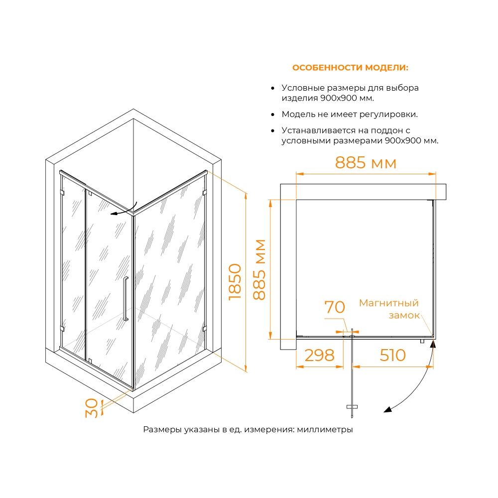 Модель представлена в чёрном исполнении профиля и фурнитуры, также обратите внимания, все уплотнители выполнены так же в чёрном цвете, что подчёркивает сдержанную стилистику душевых углов.