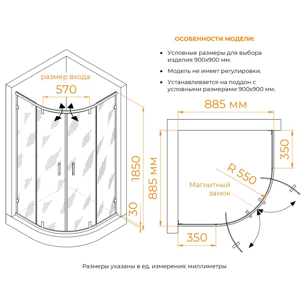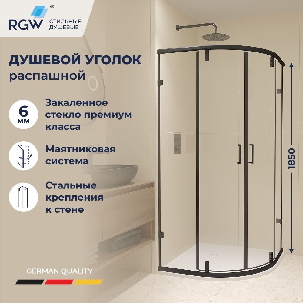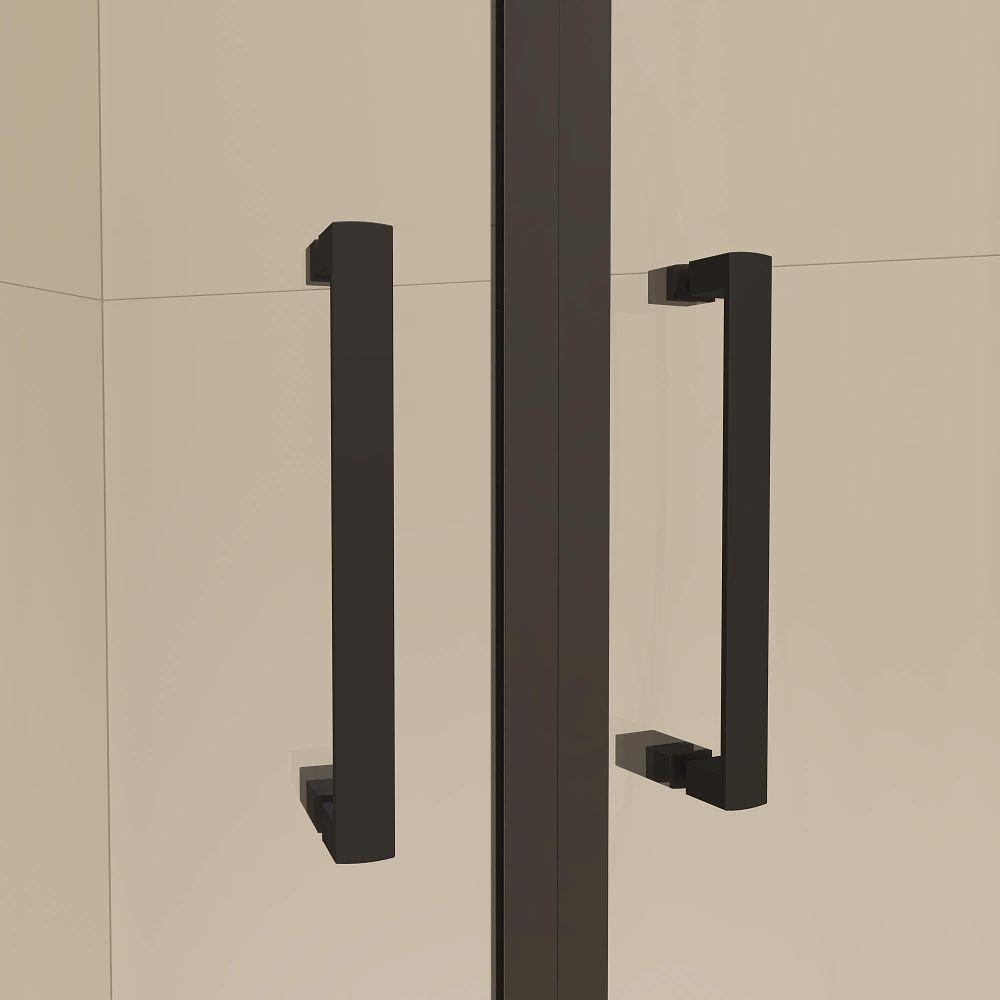 Модель представлена в чёрном исполнении профиля и фурнитуры, также обратите внимания, все уплотнители выполнены так же в чёрном цвете, что подчёркивает сдержанную стилистику душевых углов.