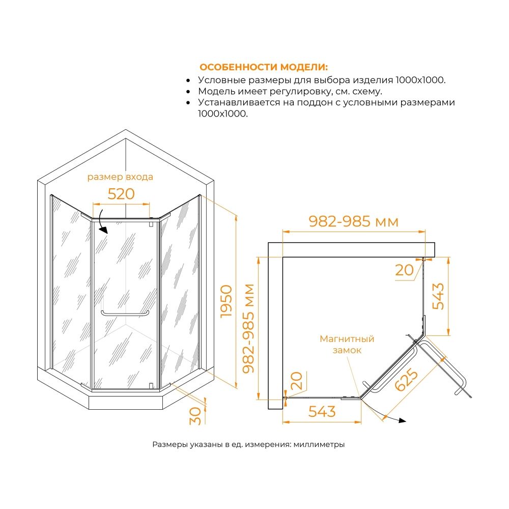 Стекло душевого уголка прозрачное, что создает ощущение простора и света. Оно также имеет покрытие анти капля Easy Clean, которое предотвращает образование водных разводов и легко чистится. Высота душевого угла составляет 1950 мм, что позволяет комфортно использовать его для людей разного роста.