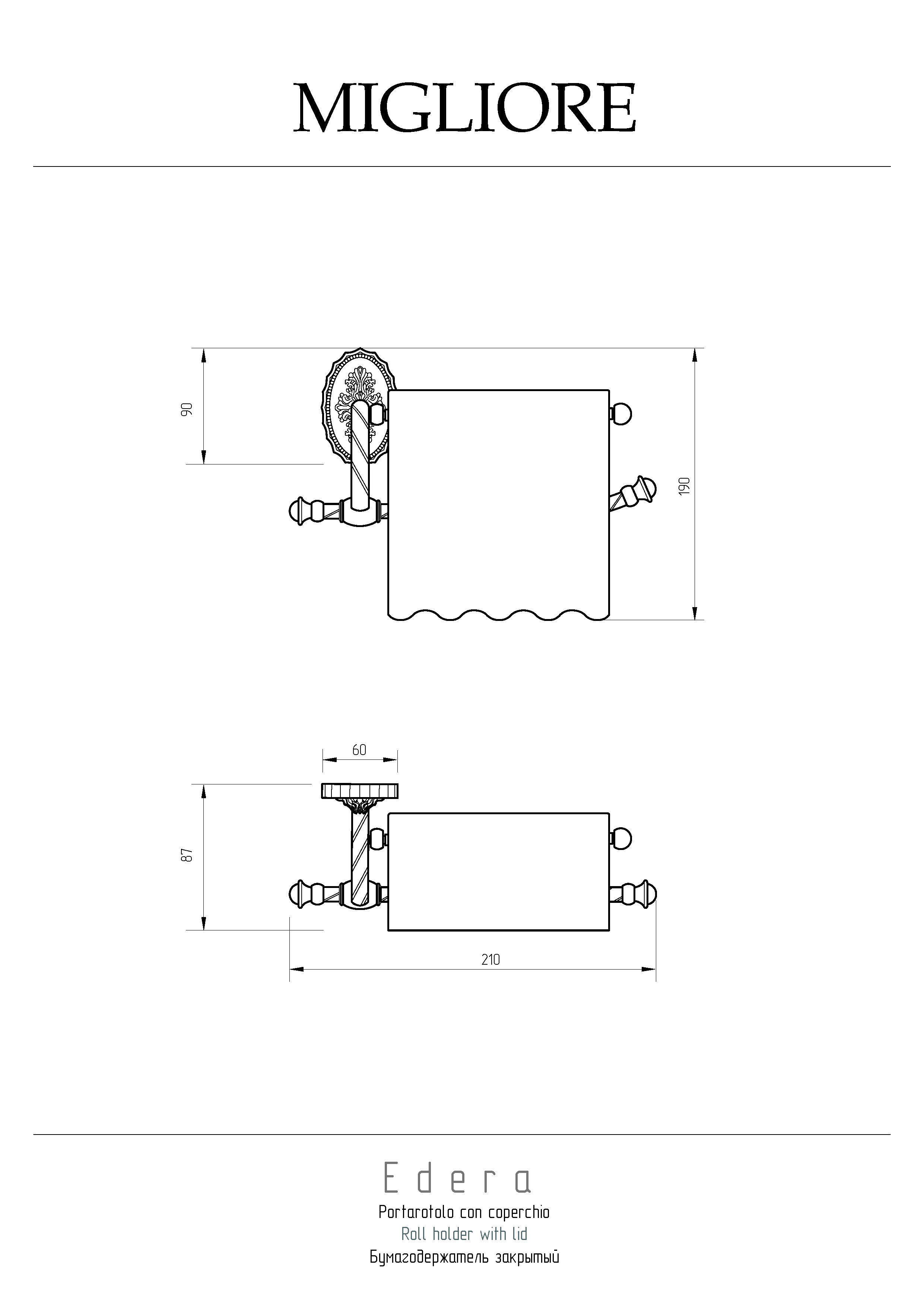 Бумагодержатель закрытый коллекции EDERA бренда MIGLIORE — это один из необходимых аксессуаров для ванной комнаты. Бумагодержатель с крышкой смотрится эстетично, и крышка защищает бумагу от попадания брызг. Благодаря витым элементам и необычной овальной розетке аксессуары коллекции EDERA будут смотреться элегантно и оригинально в классическом интерьере ванной комнаты.