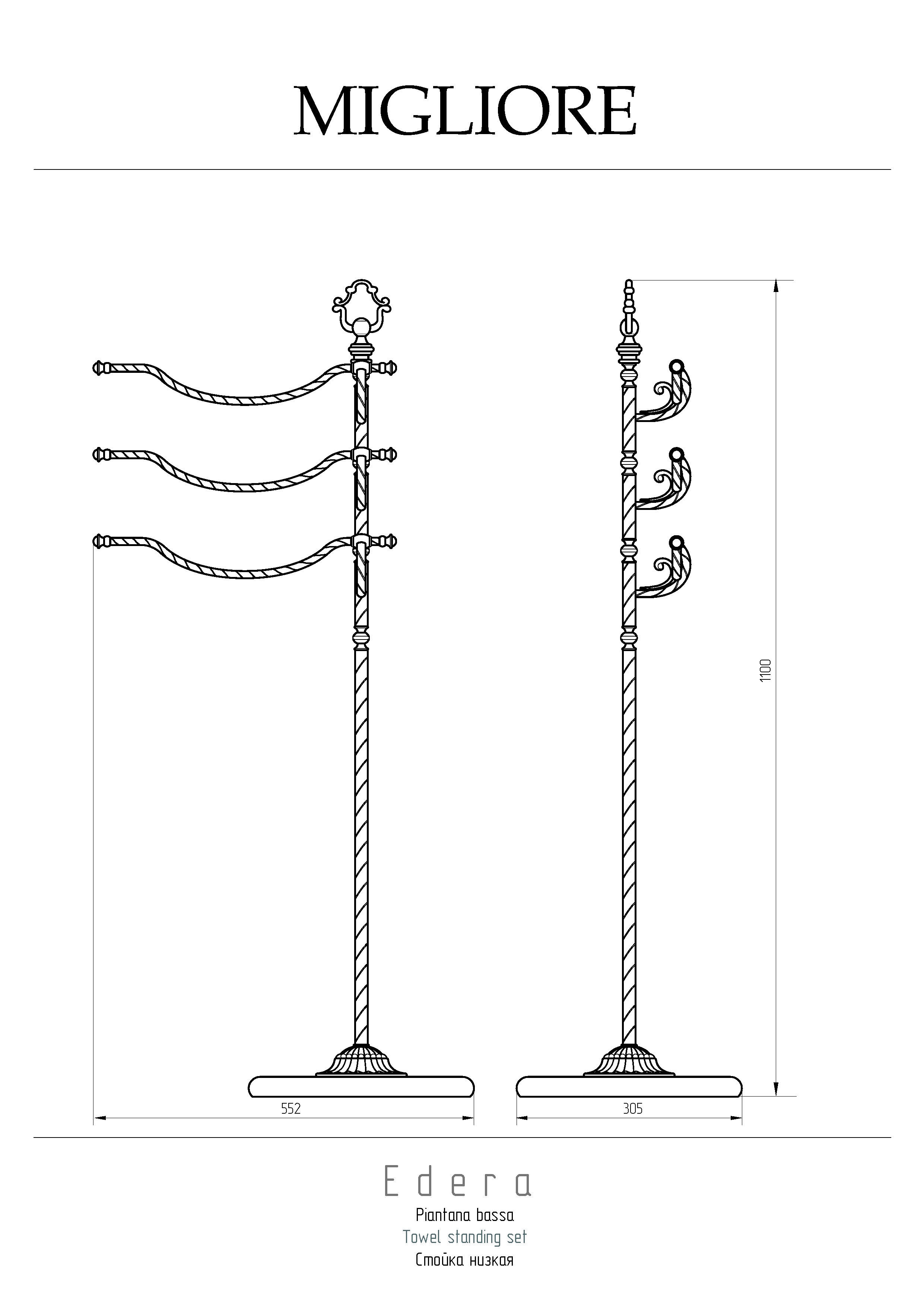 Стойка низкая коллекции EDERA бренда MIGLIORE - это многофункциональный аксессуар для ванной комнаты с тремя поворотными перекладинами для полотенец. Благодаря витым элементам аксессуары коллекции EDERA будут смотреться элегантно в классическом интерьере ванной комнаты.
