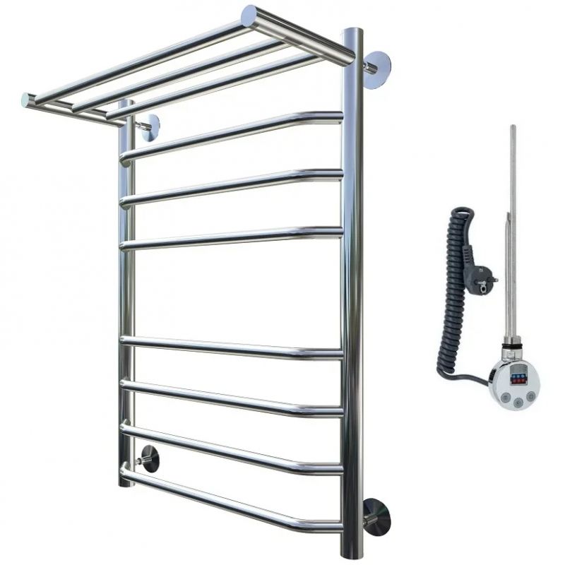 Электрический полотенцесушитель Тругор Браво 2 элТЭН 80x40 см с полкой, цвет хром. Используется для просушки влажных вещей и полотенец, а также дополнительного обогрева помещения. Отсутствует вероятность замерзания теплоносителя. Изготовлен из пищевой нержавеющей трубы марки AISI 201, которая отличается стойкостью к высоким температурам и образованию коррозии.