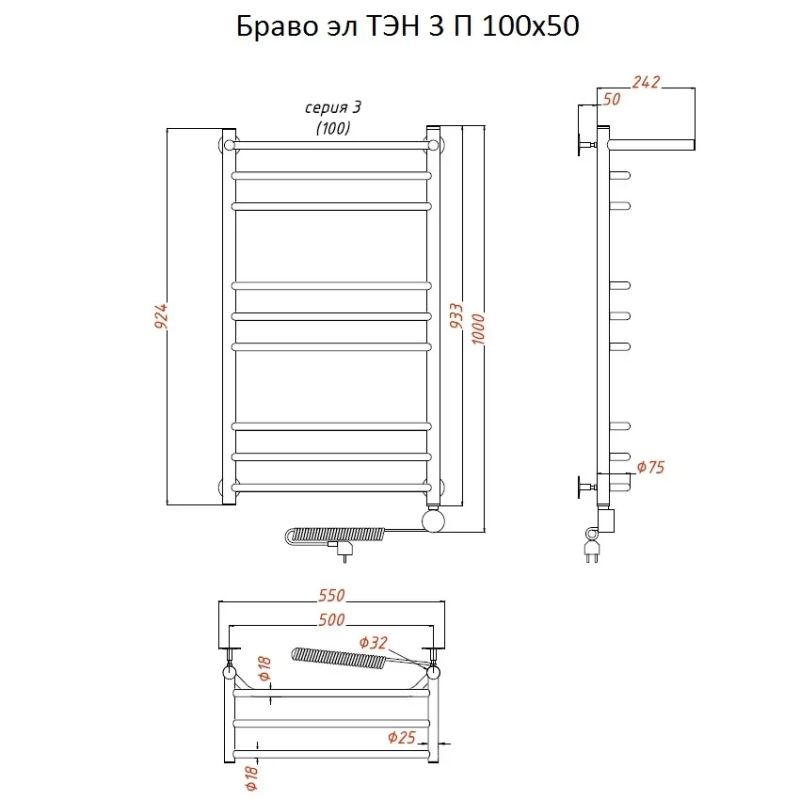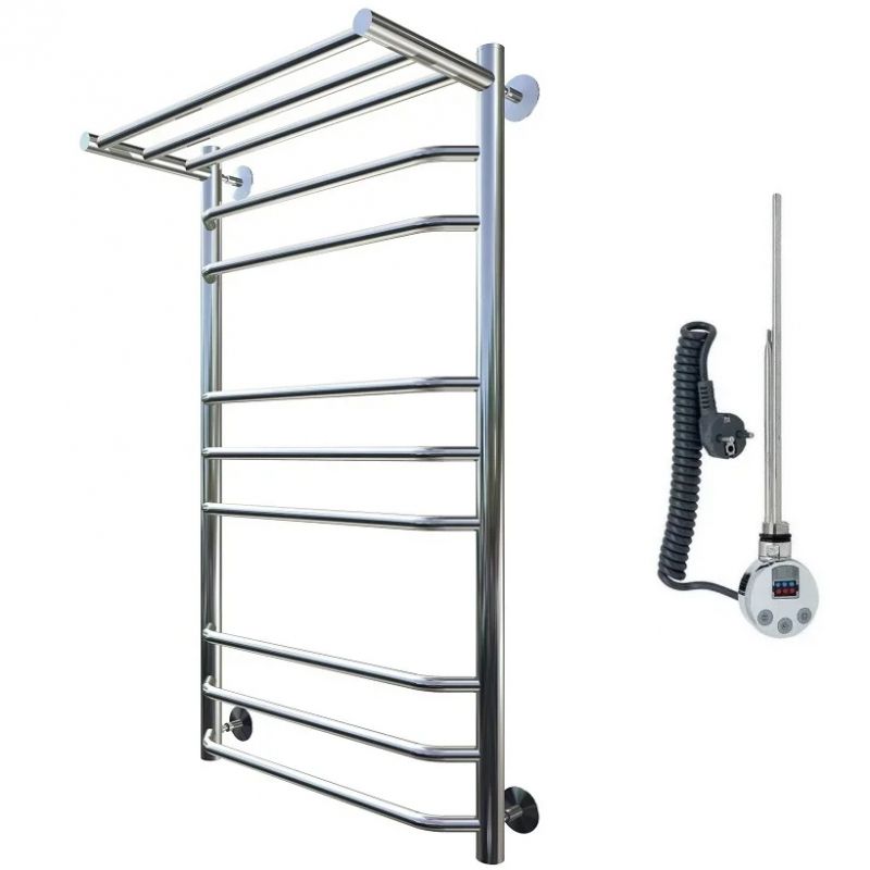 Электрический полотенцесушитель Тругор Браво 3 элТЭН 100x50 см с полкой, цвет хром. Используется для просушки влажных вещей и полотенец, а также дополнительного обогрева помещения. Отсутствует вероятность замерзания теплоносителя. Изготовлен из пищевой нержавеющей трубы марки AISI 201, которая отличается стойкостью к высоким температурам и образованию коррозии.