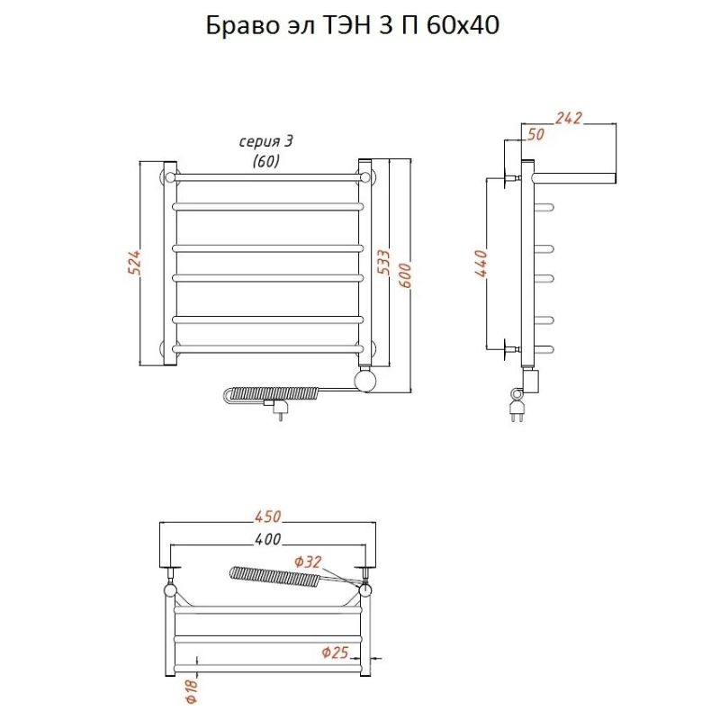 Электрический полотенцесушитель Тругор Браво 3 П элТЭН 60x40 см с полкой, цвет хром. Используется для просушки влажных вещей и полотенец, а также дополнительного обогрева помещения. Отсутствует вероятность замерзания теплоносителя. Изготовлен из пищевой нержавеющей трубы марки AISI 201, которая отличается стойкостью к высоким температурам и образованию коррозии.