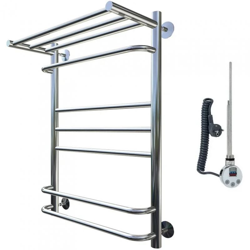 Электрический полотенцесушитель Тругор Идеал Комби 3 П элТЭН 80x50 см с полкой, цвет хром. Используется для просушки влажных вещей и полотенец, а также дополнительного обогрева помещения. Отсутствует вероятность замерзания теплоносителя. Изготовлен из пищевой нержавеющей трубы марки AISI 201, которая отличается стойкостью к высоким температурам и образованию коррозии.