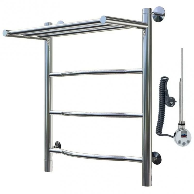 Электрический полотенцесушитель Тругор Лотос 1 элТЭН 60x50 см с полкой, цвет хром. Используется для просушки влажных вещей и полотенец, а также дополнительного обогрева помещения. Отсутствует вероятность замерзания теплоносителя. Изготовлен из пищевой нержавеющей трубы марки AISI 201, которая отличается стойкостью к высоким температурам и образованию коррозии.