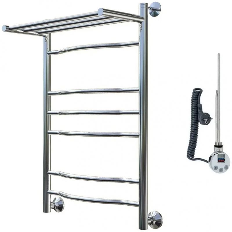 Электрический полотенцесушитель Тругор Лотос 3 элТЭН 80x50 см с полкой, цвет хром. Используется для просушки влажных вещей и полотенец, а также дополнительного обогрева помещения. Отсутствует вероятность замерзания теплоносителя. Изготовлен из пищевой нержавеющей трубы марки AISI 201, которая отличается стойкостью к высоким температурам и образованию коррозии.