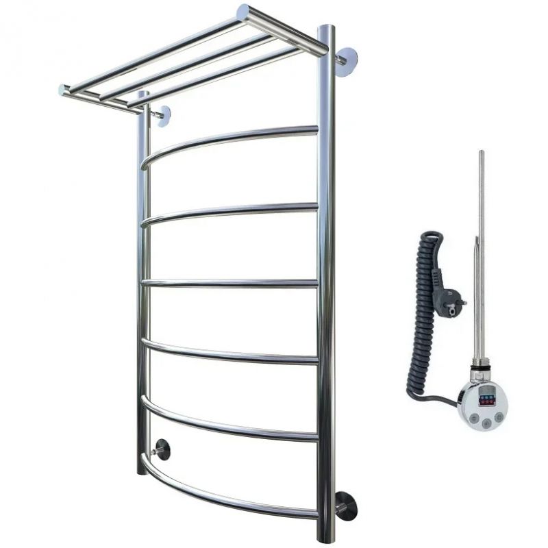 Электрический полотенцесушитель Тругор Приоритет 1 элТЭН 100x60 см с полкой, цвет хром. Используется для просушки влажных вещей и полотенец, а также дополнительного обогрева помещения. Отсутствует вероятность замерзания теплоносителя. Изготовлен из пищевой нержавеющей трубы марки AISI 201, которая отличается стойкостью к высоким температурам и образованию коррозии.