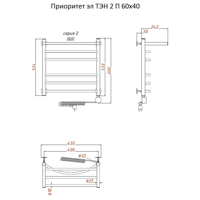 Электрический полотенцесушитель Тругор Приоритет 2 элТЭН 60x40 см с полкой, цвет хром. Используется для просушки влажных вещей и полотенец, а также дополнительного обогрева помещения. Отсутствует вероятность замерзания теплоносителя. Изготовлен из пищевой нержавеющей трубы марки AISI 201, которая отличается стойкостью к высоким температурам и образованию коррозии.