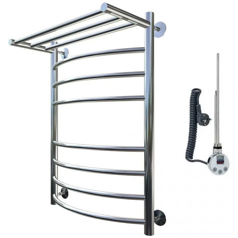 Электрический полотенцесушитель Тругор Приоритет 2 элТЭН 80x60 см с полкой, цвет хром. Используется для просушки влажных вещей и полотенец, а также дополнительного обогрева помещения. Отсутствует вероятность замерзания теплоносителя. Изготовлен из пищевой нержавеющей трубы марки AISI 201, которая отличается стойкостью к высоким температурам и образованию коррозии.