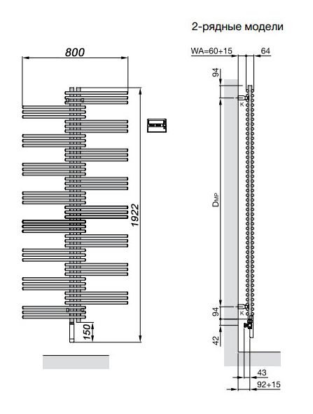 Электрический полотенцесушитель Zehnder Yucca YSDE-180-080/YD двухрядный. Цвет - белый (RAL 9016). Электропатрон WIVAR с инфракрасным блоком дистанционного управления. Электропатрон 1200 Вт. Декоративный кожух для электропатрона WIVAR в цвет. Монтажный комплект в цвет полотенцесушителя.