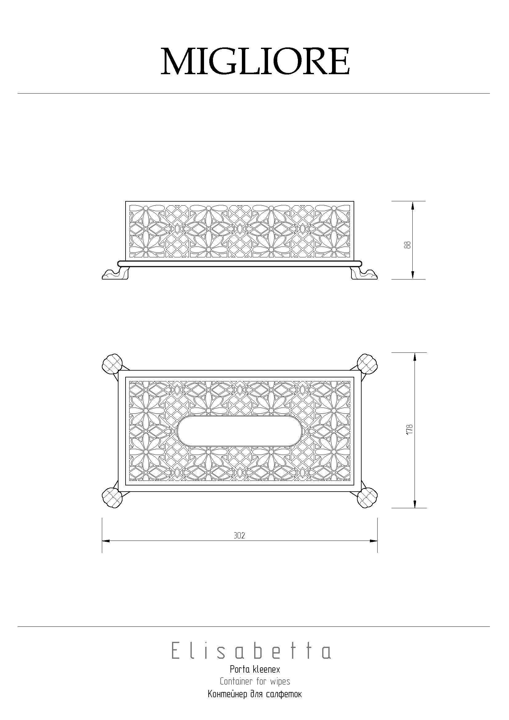 Контейнер для салфеток коллекции ELISABETTA бренда MIGLIORE подходит почти для всех стандратных упаковок бумажных салфеток, а благодаря ажурному узору станет прекрасным украшением интерьера любой комнаты. Также будет замечательным подарком.