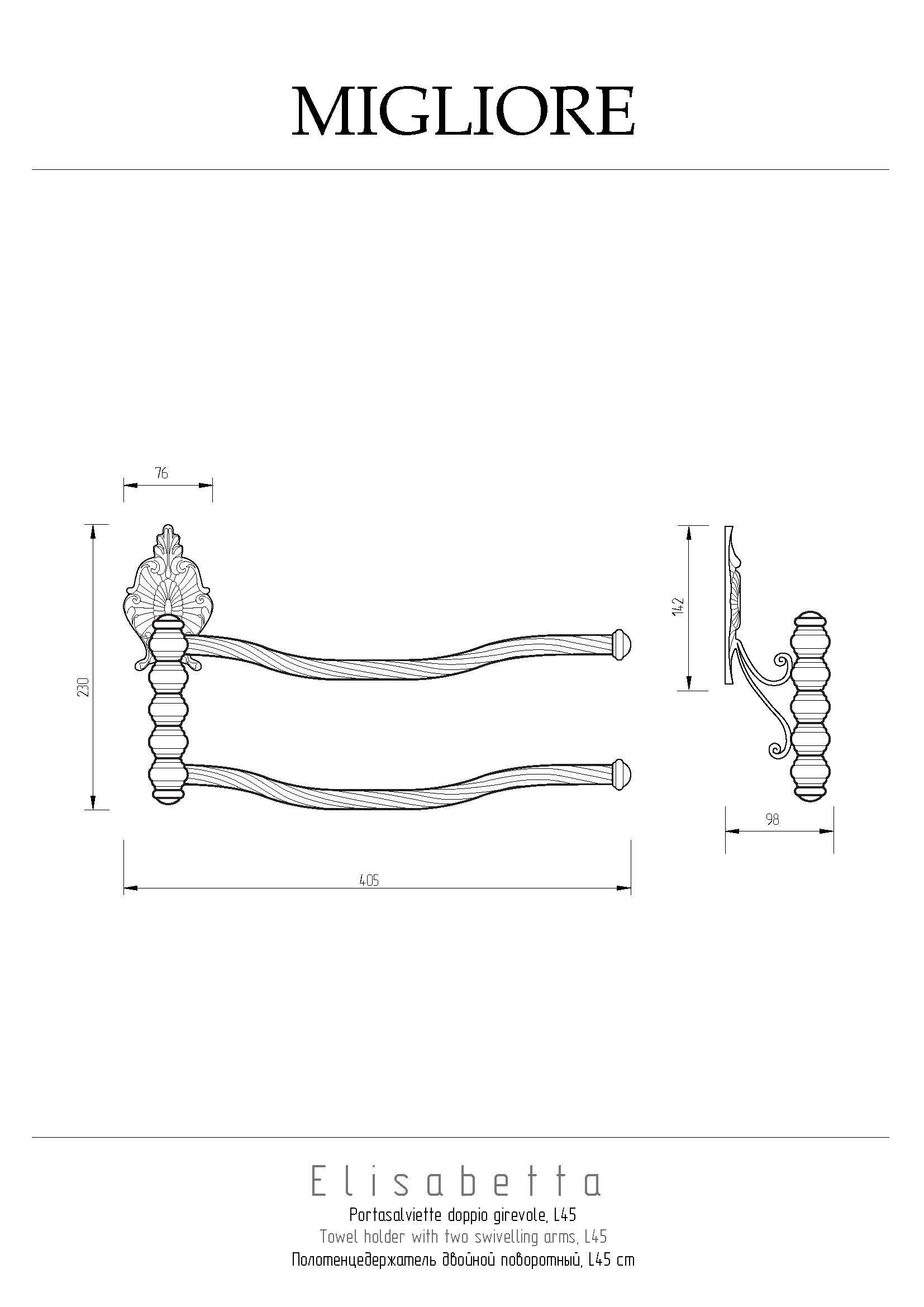 Полотенцедержатель двойной поворотный коллекции ELISABETTA бренда MIGLIORE длиной 45 см очень удобен в использовании — для него достаточно небольшого пространства, и держатели можно развернуть в одну или другую сторону, в зависимости от наличия места на стене. Розетки аксессуара имеет необычную форму, и удобный крепеж.