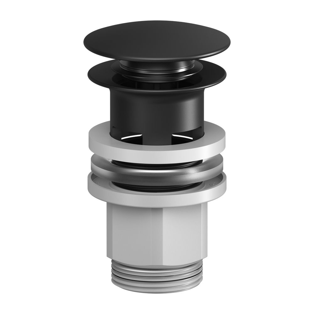Система клик-клак управляется нажатием на пробку слива. Покрытие устойчиво к коррозии появлению царапин сколов и потускнению. Круглая заглушка черного матового цвета.