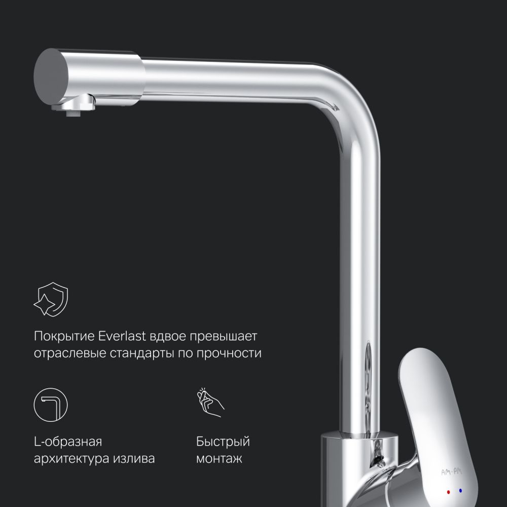 Долгожданное пополнение в линейке кухонных смесителей Like – смеситель для кухни со встроенным каналом для питьевой воды. L-образная архитектура излива позволит разместить смеситель на мойке любого размера и даже под низкими шкафчиками при полном сохранении функционала и комфорта в использовании.