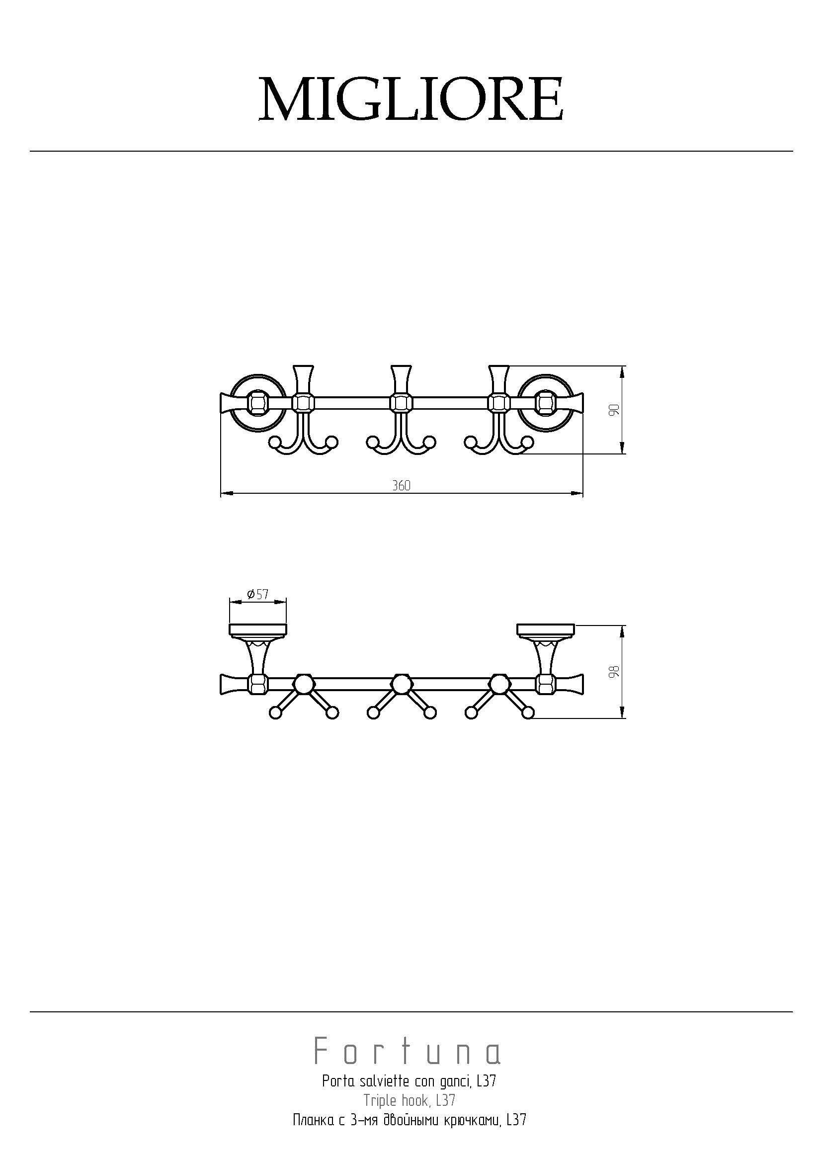 Планка с 3-мя крючками серии FORTUNA бренда MIGLIORE- многофункциональный аксессуар, который можно использовать в ванной комнате, сауне, на кухне, в корридоре или кладовке. Общая длина составляет 37 см, 3 крючка классической формы расположены на достаточном удалении друг от друга, что позволит удобно разместить большие полотенца и любые вещи. Изделие выполнено из латуни и имеет высококачественное хромо-никелиевое покрытие, которое при правильном уходе надолго сохранит свой блеск. Рекомендуется использовать чистящее средство бренда MIGLIORE для смесителей и аксессуаров с хромированным покрытием.