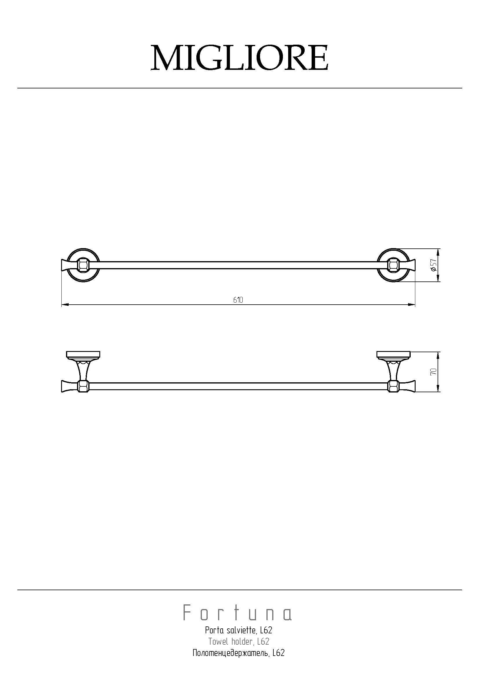 Полотенцедержатель серии FORTUNA бренда MIGLIORE - функциональный аксессуар для ванной комнаты. Его длина 62 см подходит для полотенца для рук, лица и тела. Изделие выполнено из латуни и имеет высококачественное хромо-никелиевое покрытие, которое при правильном уходе надолго сохранит свой блеск. Рекомендуется использовать чистящее средство бренда MIGLIORE для смесителей и аксессуаров с хромированным покрытием.