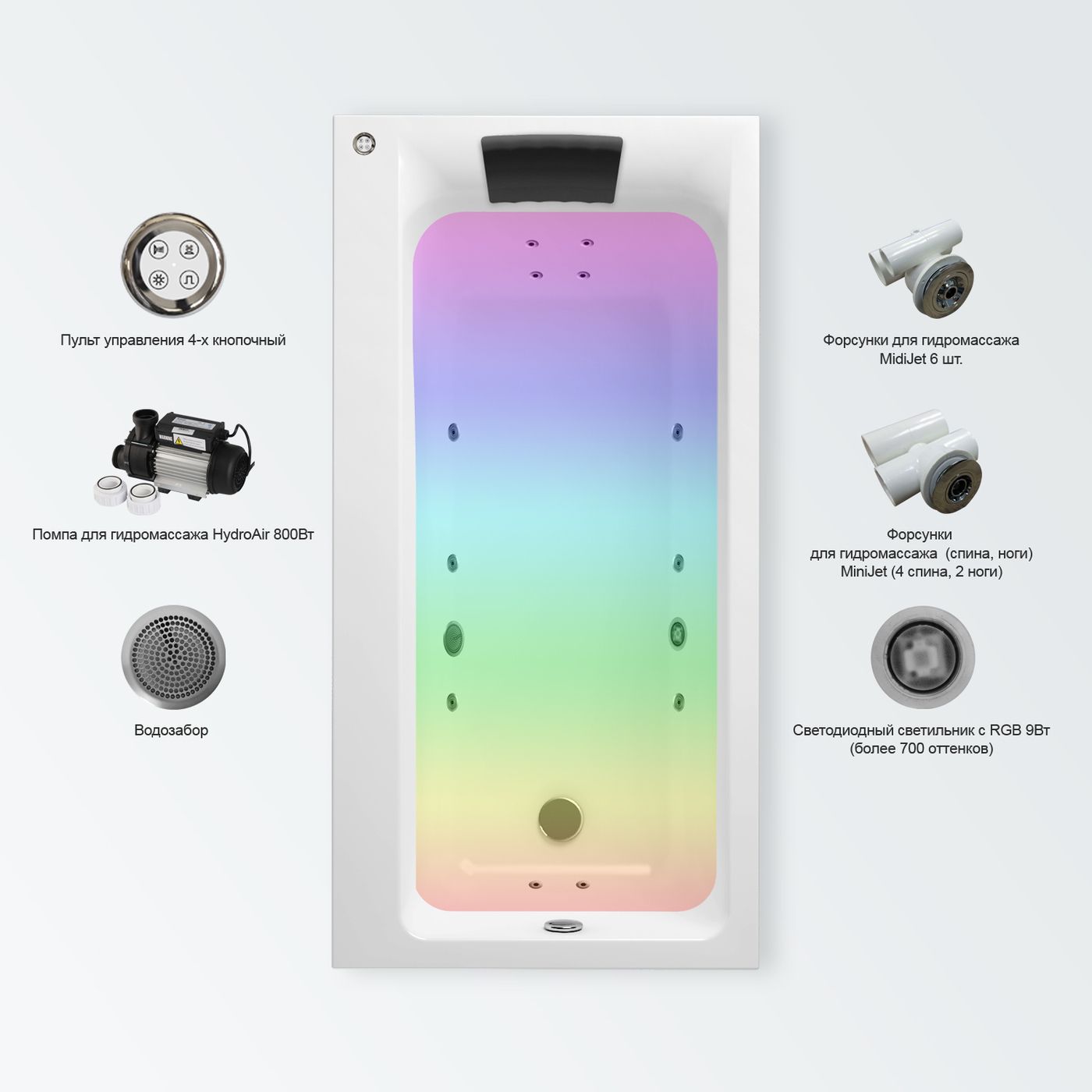Хромотерапия (система подводной подсветки воды с изменяющимся цветом) создает очень красивый эффект светящейся воды, формирует чувство комфорта и романтики. Светильники цветной подсветки на RGB светодиодах обладают очень ярким свечением, малой потребляемой мощностью и окрашивает воду в более чем 700 цветовых оттенков.