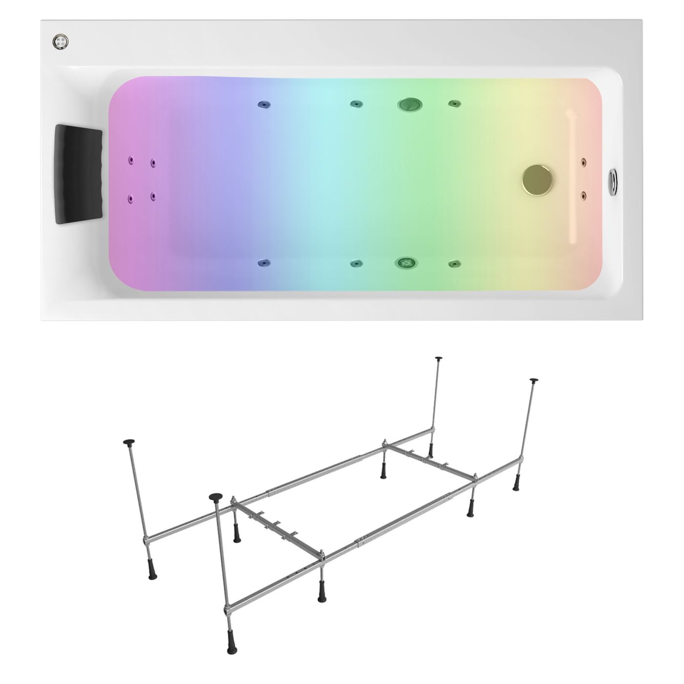Дополнительно ванна может быть доукомплектована ультра плоскими лицевыми и торцевыми экранами, гидро-, аэро-массажными системами, хромотерапией.