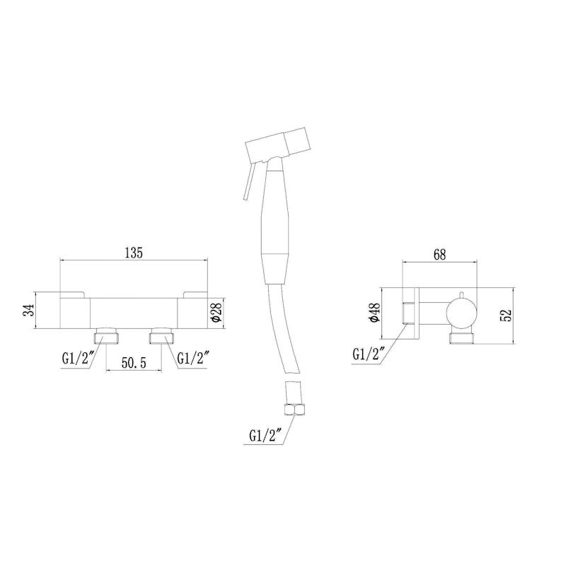 Управление: две отдельные ручки — одна регулирует подачу воды на гигиенический душ, вторая отвечает за дополнительный выход 1/2" (например, для стиральной машины, биде или фильтра)