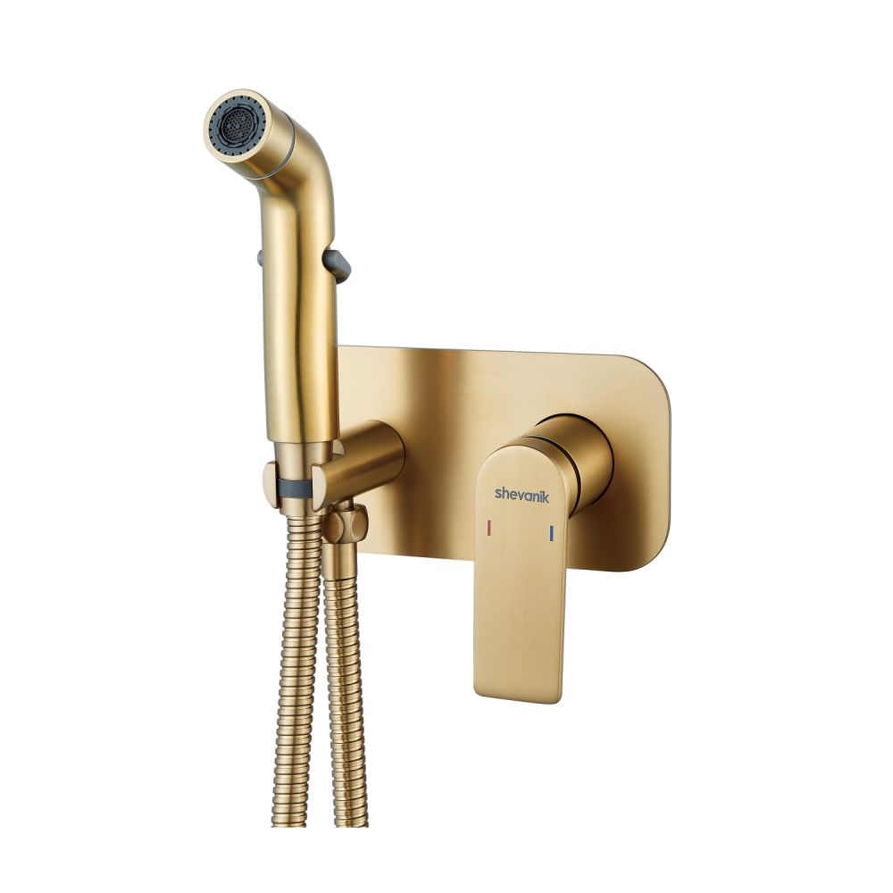 Гигиенический душ со смесителем Shevanik S4105G в современном цвете золотой сатин (матовое полированное золото) — это идеальное решение для вашей ванной комнаты, сочетающее в себе элегантность и функциональность. Смеситель выполнен из прочной латуни, что гарантирует его долговечность и надежность. Благодаря скрытому монтажу в стену, он обеспечивает аккуратный и современный внешний вид, а керамический картридж и рычажное управление делают его использование легким и удобным.