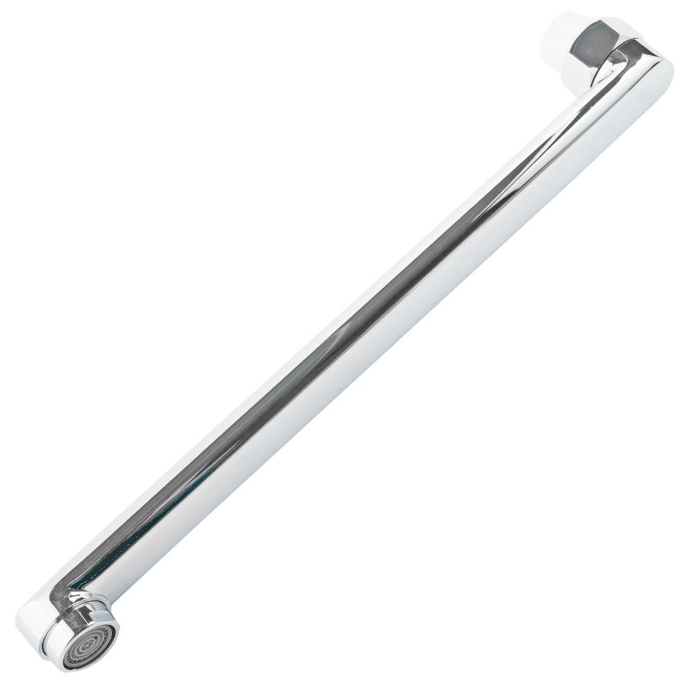Излив имеет длину 40 см, он считается длинным. Такие модели идеально подходят для универсальных настенных смесителей. Длинный излив обеспечивает необходимое расстояние до мойки, расположенной рядом с ванной. Поворотный механизм дает возможность использовать гусак и там, и там.