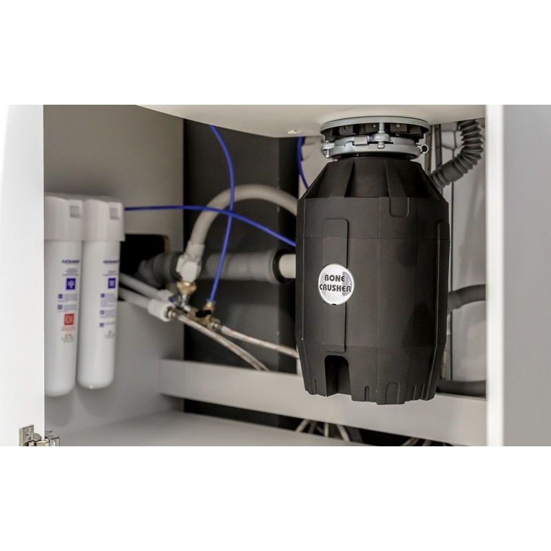 Премиальная модель в линейке бытовых измельчителей A.M.I BONE CRUSHER. По праву считается самой мощной и лучшей из представленных на мировом рынке диспоузеров. Перерабатывает любые пищевые отходы в любом количестве. Скорость вращения диска 4000 оборотов в минуту при запуске и 2800 оборотов в минуту с момента начала работы. Не требует автореверса. Может устанавливаться как в квартире, так и в загородном доме. Срок службы прибора более 25 лет. Для работы не требует дополнительных расходных материалов. Благодаря уникальному строению рабочей камеры, остатки перерабатываемых пищевых отходов не остаются на стенках и полностью смываются в канализацию. Это предотвращает появлению запаха из сливного отверстия мойки. Модель снабжена магнитным улавливателем, который помогает столовым приборам и другим посторонним металлическим предметам не попасть в измельчитель пищевых отходов. Прибор полностью статичен, не вызывает вибрацию, устанавливается на любой тип моек.