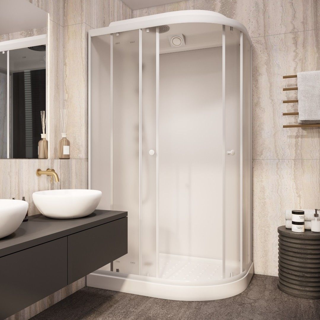 Просторная душевая кабина актуальна для любого оформления ванной комнаты и впишется в любой интерьер. Презентабельный вид придают закаленные стекла, которые способствуют надежности и не боятся химических средств. Это позволяет дольше сохранить внешнюю привлекательность кабины. Наличие в крыше вентиляционных отверстий, закрытых дефлекторами, позволит, при необходимости, снизить влажность, путем подключения к вентиляционной системе.