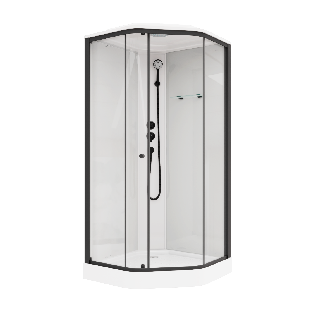 Пентагональная (пятиугольная) модель -отличное дизайнерское решение как для маленьких ванных комнат, так и для тех, кто ценит свободный объем в помещении. За счет формы кабины любой интерьер будет выглядеть современным и привлекательным. Крыша имеет вентиляционные отверстия, закрытые дефлекторами, что позволяет, при необходимости, снизить влажность, путем подключения к вентиляционной системе.