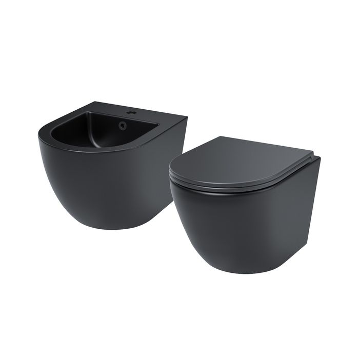 Комплект подвесной керамики Blanco в трендовом матовом черном цвете: унитаз и биде в трендовых округлых формах. Позволит оформить ванную в едином стиле с комфортом и элегантностью. Удобное продуманное решение и выгодная покупка.
