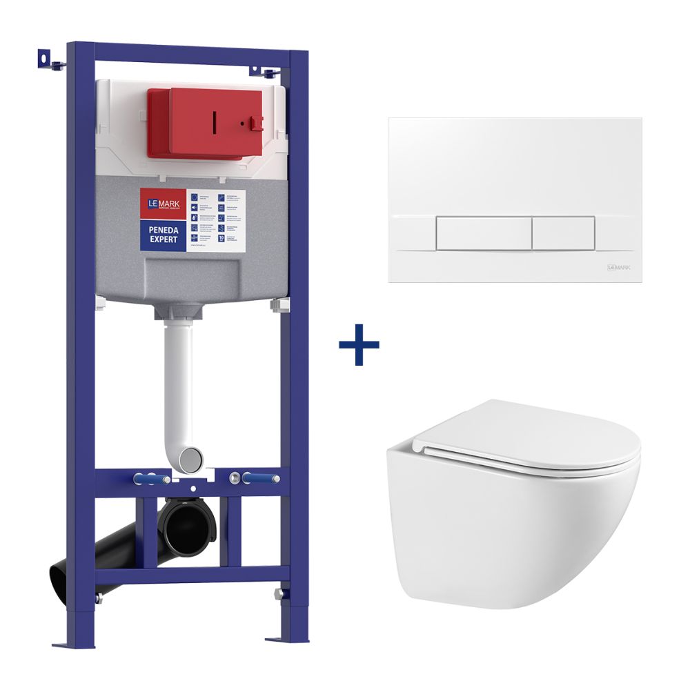 • Кнопка смыва BIT для инсталляции, механическая, белый глянец • Унитаз Lemark GLAZER подвесной безободковый с сиденьем микролифт, смыв вихревой Тонадо 3.0, белый глянец