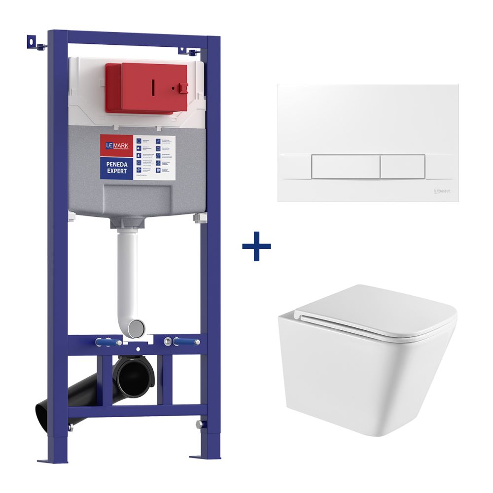 • Кнопка смыва BIT для инсталляции, механическая, белый глянец • Унитаз Lemark FLOREX подвесной безободковый с сиденьем микролифт, смыв вихревой Тонадо 3.0, белый глянец