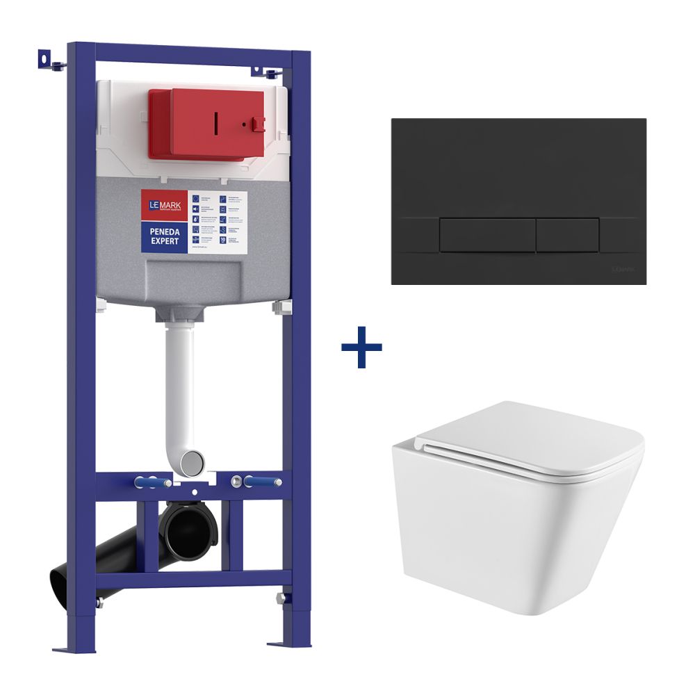 • Кнопка смыва BIT для инсталляции, механическая, чёрный матовый soft touch • Унитаз Lemark FLOREX подвесной безободковый с сиденьем микролифт, смыв вихревой Тонадо 3.0, белый глянец