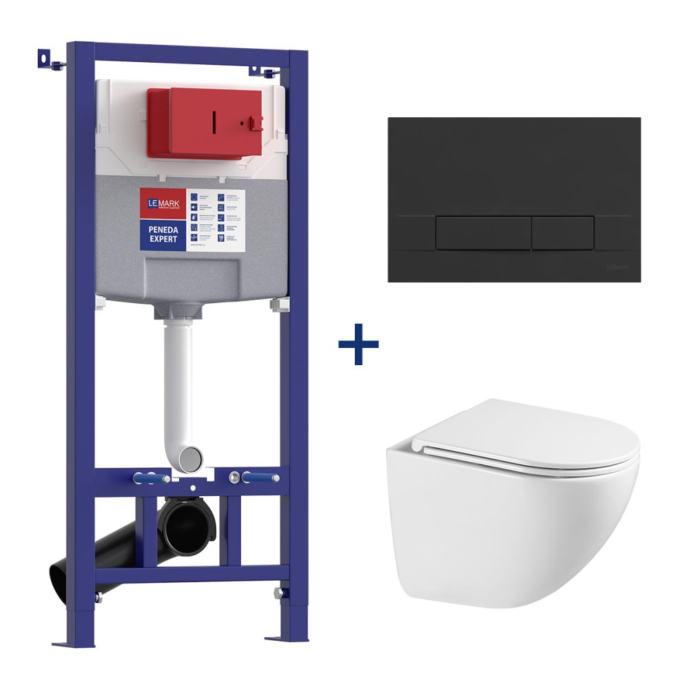 • Кнопка смыва BIT для инсталляции, механическая, чёрный матовый soft touch • Унитаз Lemark GLAZER подвесной безободковый с сиденьем микролифт, смыв вихревой Тонадо 3.0, белый глянец