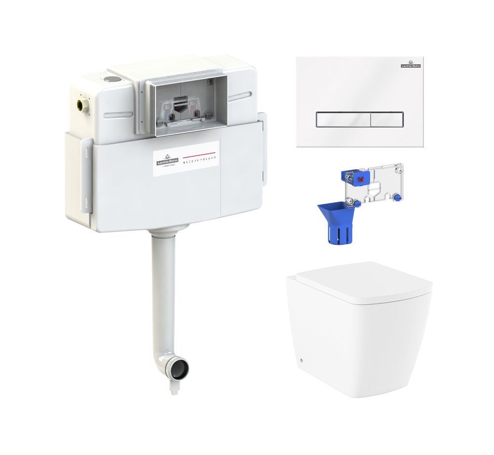 клавиша смыва; комплект крепежа; сиденье с крышкой; сливной бачок; сливной механизм; дозатор для дезинфицирующих средств |