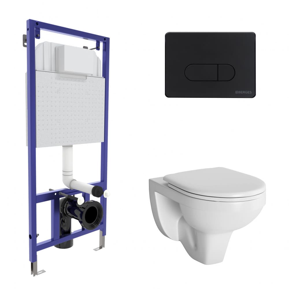 Полный Комплект BERGES для монтажа подвесного унитаза:инсталляция NOVUM525: толщина бачка 80 мм, смыв 3/6 литра, нагрузка 400 кг, антикоррозийное покрытие, кнопка D5 черная Soft Touch, пластик, унитаз GAMMA: Каскадный смыв, сидение дюропласт Gamma: микролифт,быстросъемное. Все крепежи для установки в комплекте. Возможность установки в угол. Гарантия 10 лет.