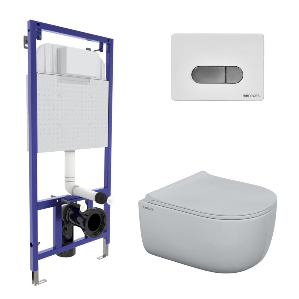 Полный комплект BERGES для монтажа подвесного унитаза: узкая инсталляция NOVUM525: толщина бачка 80мм, смыв 3/7 литра, нагрузка 400 кг, антикоррозийное покрытие, кнопка D7 белая/кнопка хром, унитаз EGO Rimless, сидение дюропласт Toma Slim SO, микролифт, быстросьем. Все крепежи для установки в комплекте. Возможность установки в угол.
