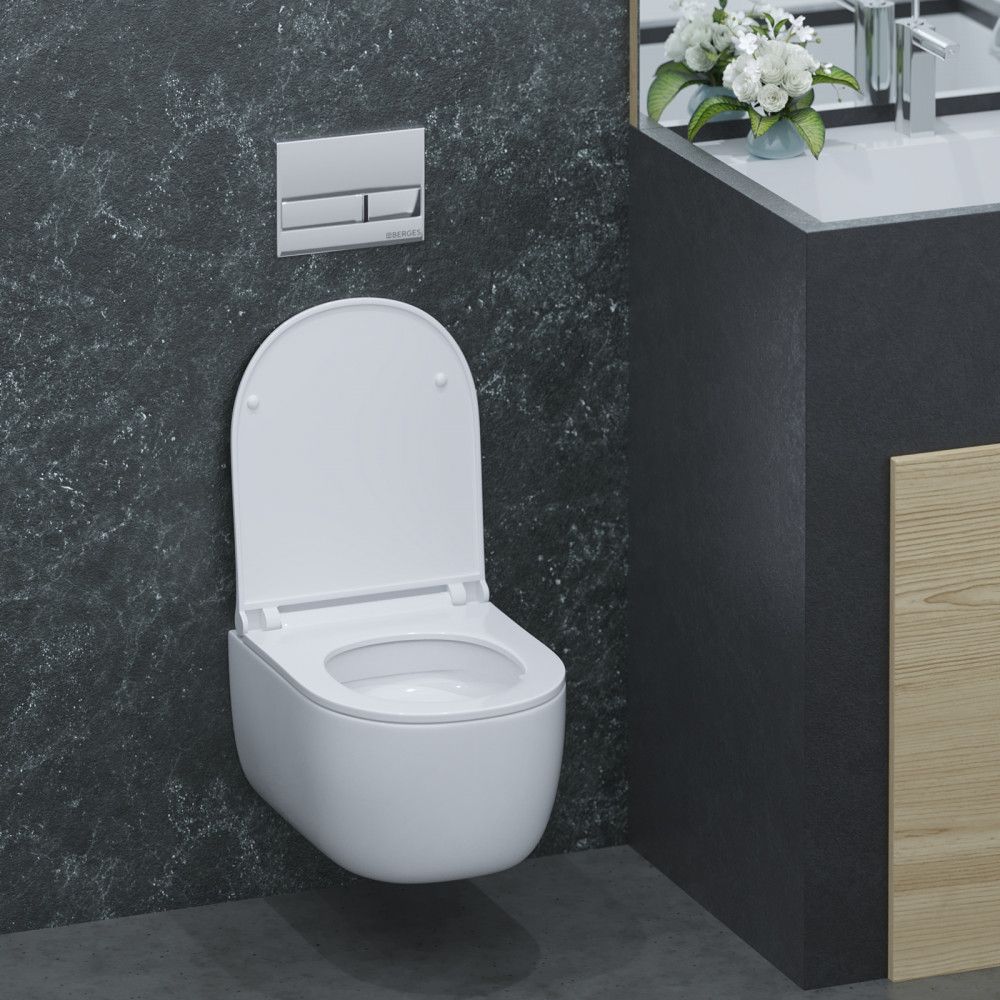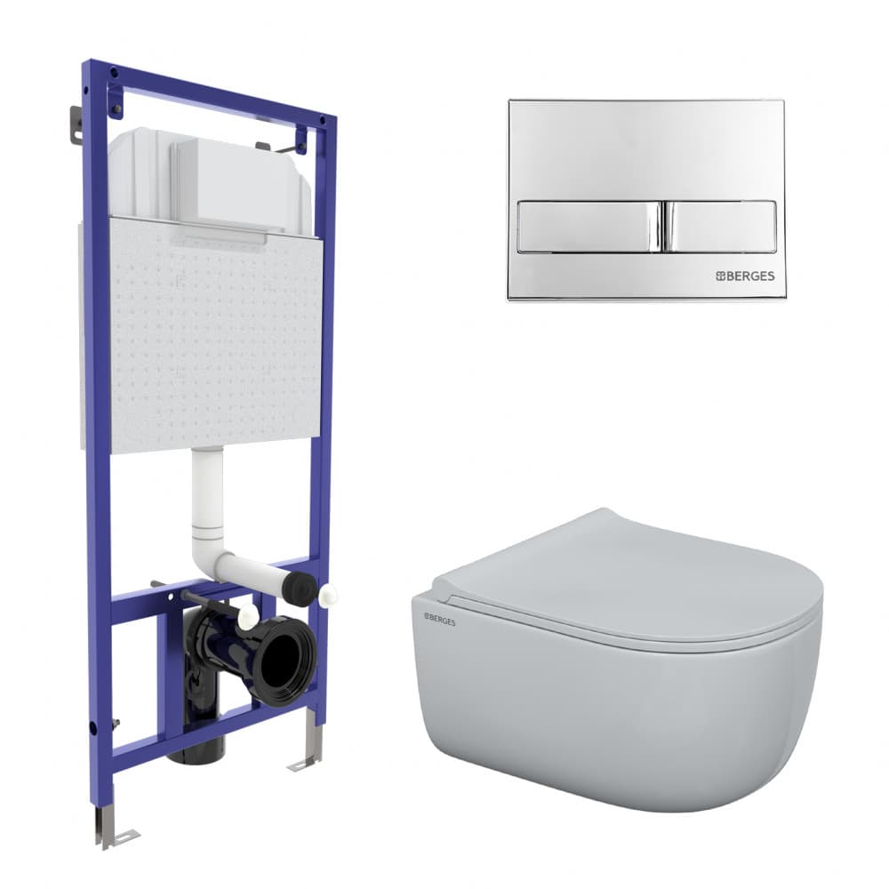 Полный комплект BERGES для монтажа подвесного унитаза: узкая инсталляция NOVUM525: толщина бачка 80мм, смыв 3/7 литра, нагрузка 400 кг, антикоррозийное покрытие, кнопка L3 хром глянец, гальваника,унитаз EGO Rimless, сидение дюропласт Toma Slim SO, микролифт, быстросьем. Все крепежи для установки в комплекте. Возможность установки в угол.