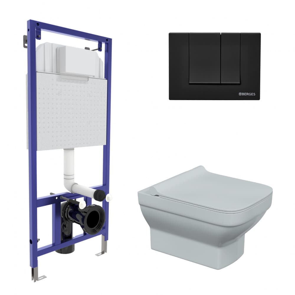 Полный комплект BERGES для монтажа подвесного унитаза: узкая инсталляция NOVUM525: толщина бачка 80мм, смыв 3/7 литра, нагрузка 400 кг, антикоррозийное покрытие, кнопка S5 SoftTouch черная, унитаз LEVEL Rimless, сидение дюропласт Level Slim SO, микролифт, быстросъем. Все крепежи для установки в комплекте. Возможность установки в угол.