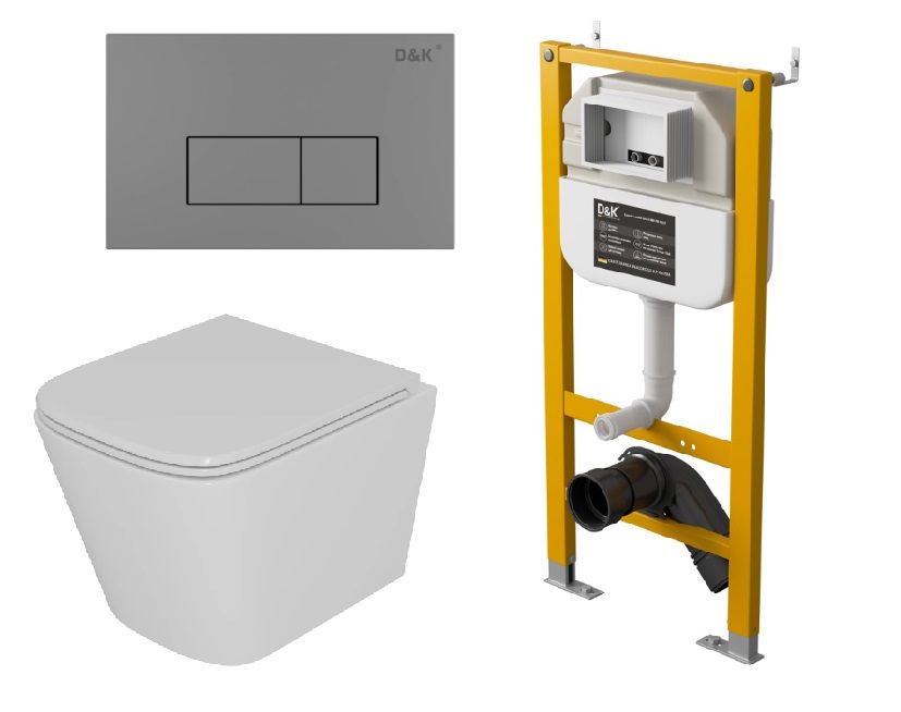 Комплект Унитаз подвесной безободковый (торнадо) D&K Berlin DT1436516, 490*340*350мм, сиденье микролифт, белый+Инсталляция рамная скрытого монтажа D&K DI8050127, 500*117*1270мм, для подвесного унитаза, универсальная+Клавиша смыва D&K Rhein DB1499006 графит |