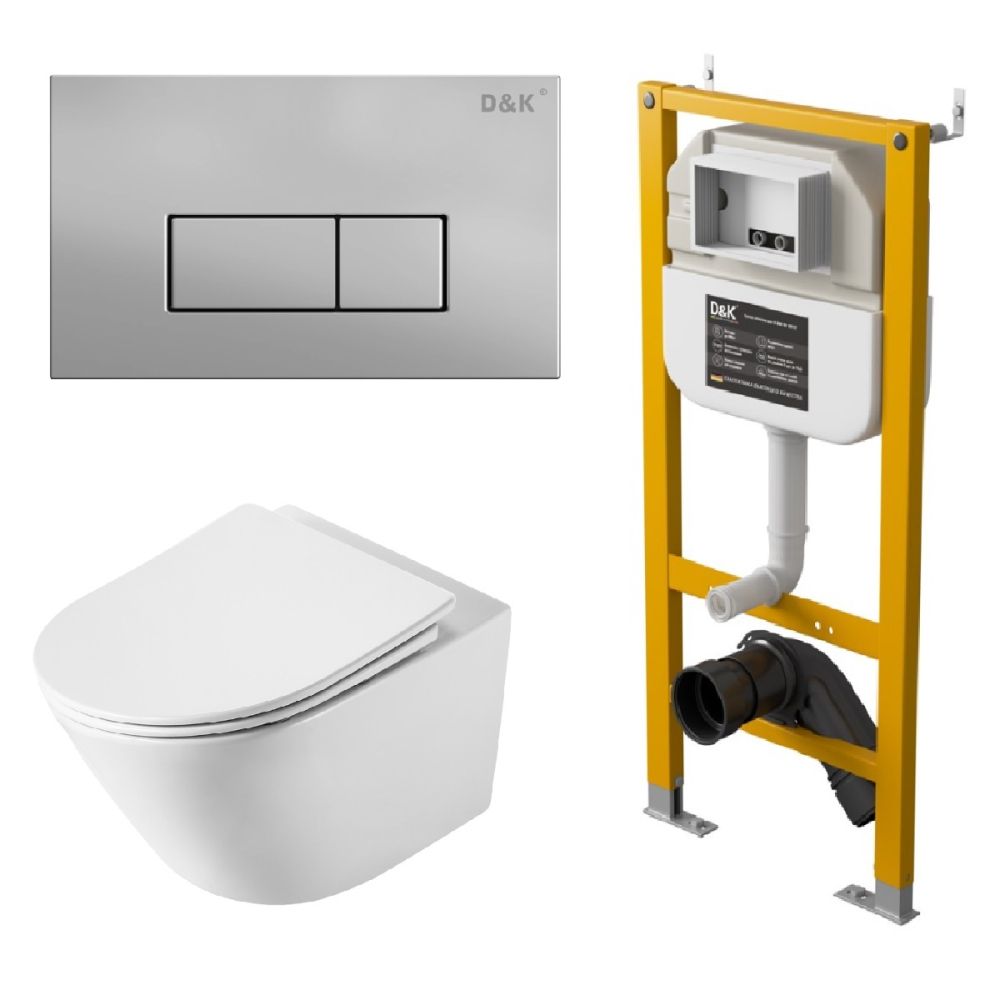 Комплект Унитаз подвесной безободковый (торнадо) DQ Rhein.Bach DT1476516, 500*360*350мм, сиденье микролифт, белый+Инсталляция рамная скрытого монтажа DQ DI8050127, 500*117*1270мм+Клавиша смыва DQ Rhein DB1499002 (арт.инсталл DI8050127), матовый хром