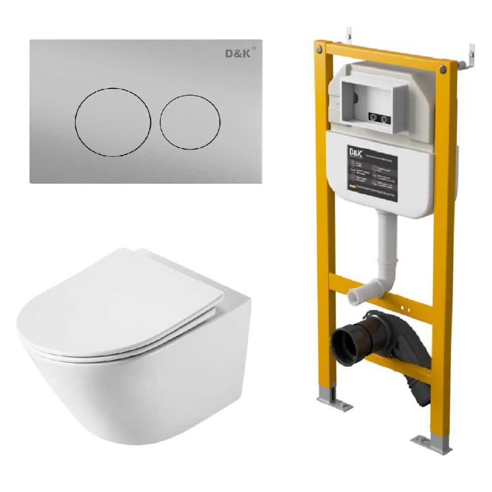 Комплект Унитаз подвесной безободковый (торнадо) DQ Rhein.Bach DT1476516, 500*360*350мм, сиденье микролифт, белый+Инсталляция рамная скрытого монтажа DQ DI8050127, 500*117*1270мм +Клавиша смыва D&K Bayern DB1529002.2 (арт.инсталл DI8050127), матовый хром