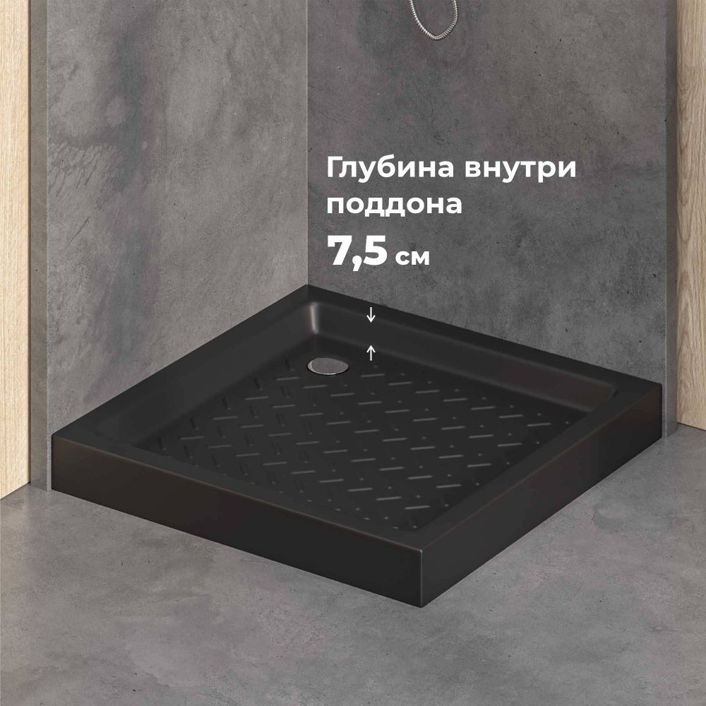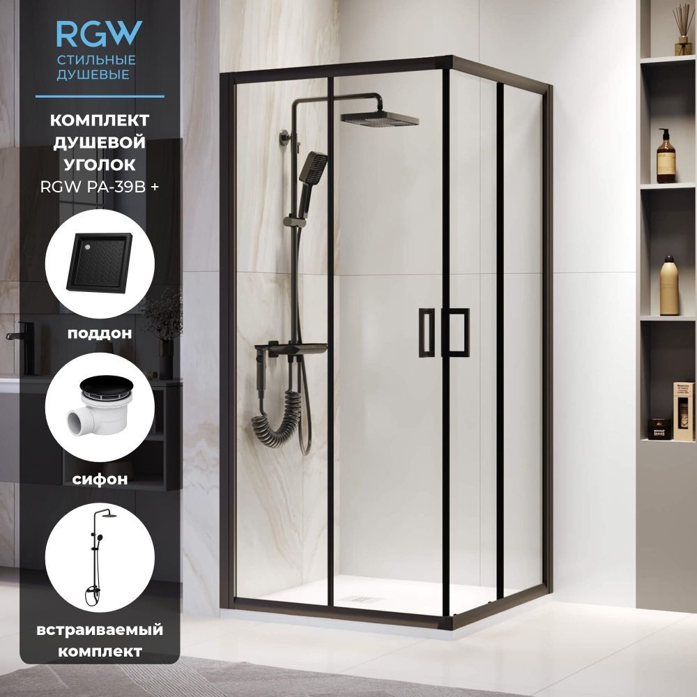 Комплект квадрат: Душевой уголок RGW PA-39B 900x900 + Душевой поддон керамический, квадратный, черный RGW CR + Сифон для душевых поддонов RGW Velplex QYD-06 Черный + Душевая стойка черная со смесителем из стали RGW SP-24B